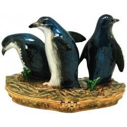 Hand sculpted & enamelled this high quality Fairy Penguins trinket box is a part of deva Australia’s large range of ornate animal figurines, which are hand cast in metal to create exquisite trinket boxes, inspired by Fabergé style trinket boxes. Each deva Australia collectable trinket box, is skilfully sculpted to bring out life like characteristics. Hand painted fine enamels that mimic natures exquisite and vibrant palette, artistically hand set, Austrian Crystal embellishments and 18 K gold or silver trims, finish each piece, to make it a treasured collectable or keepsake. The Fairy Penguin trinket box is part of our range of Australiana or native australian animals series.