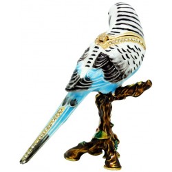Hand sculpted & enamelled this high quality, jewelled Budgie Trinket box is a part of deva Australia’s large range of ornate bird figurines, which are hand cast in metal to create exquisite trinket boxes, inspired by Fabergé style trinket boxes. Each deva Australia collectable trinket box, is skilfully sculpted to bring out life like characteristics. Hand painted fine enamels that mimic natures exquisite and vibrant palette; artistically hand-set Austrian Crystal embellishments and 18 K gold or silver plated trims, finish each piece to make it a treasured collectible or keepsake. The Blue Budgie is part of our Australiana or native Australian animal collection. It is a popular bird.