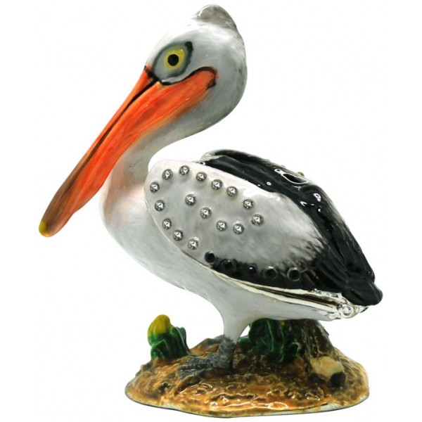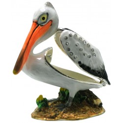 The Australian Pelican Trinket Box has a hinged opening and a secure magnetic closure. Great for storing small mementos; special messages; fine jewellery charms & nic nacs. The Australian Pelican trinket box would be great to display as a bejewelled trinket figurine in a bird lovers home or office. This Australian Pelican trinket box is finely crafted and intricateley bejewelled, it artistically captures the magnificence of this beautiful bird, which is striking to behold.