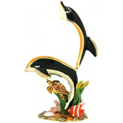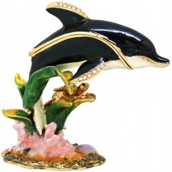 Hand sculpted & enamelled this high quality Reef Dolphin trinket box is a part of deva Australia’s large range of ornate animal figurines, which are hand cast in metal to create exquisite trinket boxes, inspired by Fabergé style trinket boxes. Each deva Australia collectable trinket box, is skilfully sculpted to bring out life like characteristics. Hand painted fine enamels that mimic natures exquisite and vibrant palette, artistically hand set, Austrian Crystal embellishments and 18 K gold or silver trims, finish each piece, to make it a treasured collectable or keepsake.