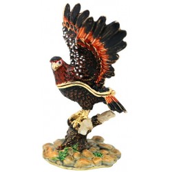 Hand sculpted & enamelled this high quality, jewelled Australian Wedge Tail Eagle Trinket box is a part of deva Australia’s large range of ornate bird figurines, which are hand cast in metal to create exquisite trinket boxes, inspired by Fabergé style trinket boxes. Each deva Australia collectable trinket box, is skilfully sculpted to bring out life like characteristics. Hand painted fine enamels that mimic natures exquisite and vibrant palette; artistically hand-set Austrian Crystal embellishments and 18 K gold or silver plated trims, finish each piece to make it a treasured collectible or keepsake. The Australian Wedge Tail Eagle is part of our Australiana or native Australian bird & animal collection.
