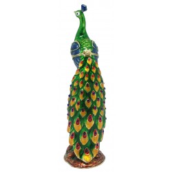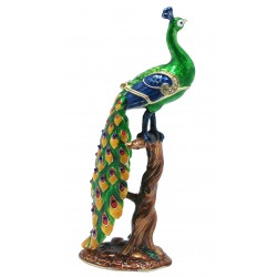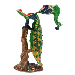 Hand sculpted & enamelled this high quality, jewelled Peacock on Tree Trunk Trinket box is a part of deva Australia’s large range of ornate bird figurines, which are hand cast in metal to create exquisite trinket boxes, inspired by Fabergé style trinket boxes. Each deva Australia collectable trinket box, is skilfully sculpted to bring out life like characteristics. Hand painted fine enamels that mimic natures exquisite and vibrant palette; artistically hand-set Austrian Crystal embellishments and 18 K gold or silver plated trims, finish each piece to make it a treasured collectible or keepsake.