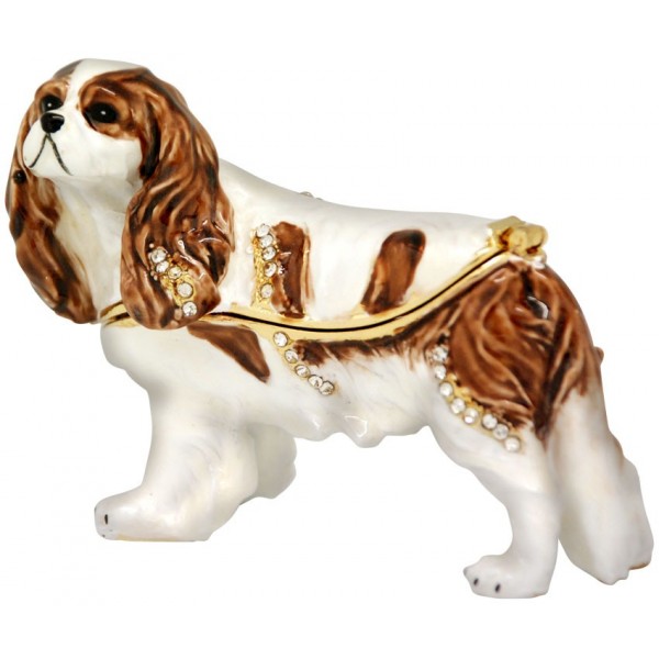 The King Charles Trinket Box has a hinged opening and a secure magnetic closure. Great for storing small mementos; special messages; fine jewellery charms & nic nacs. The King Charles trinket box would be great to display as a bejewelled trinket figurine. The King Charles trinket box makes a fine collectible or gift for dog lovers, especially if you have a King Charles pooch! - or if the symbolic King Charles energy resonates with you.