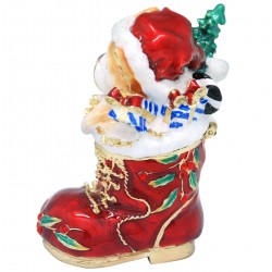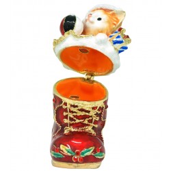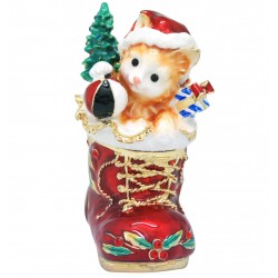 The Xmas Kitten trinket box has a hinged opening and a secure magnetic closure. Great for storing small mementos; special messages; fine jewellery charms & nic nacs. The Xmas Kitten trinket box would be great to display as a bejewelled trinket figurine. The Xmas Kitten trinket box, is a great addition to the Christmas figurines/memrobilia collections of a collector. It also makes a fine collectible or heirloom gift, to mark a special Christmas of a loved one.